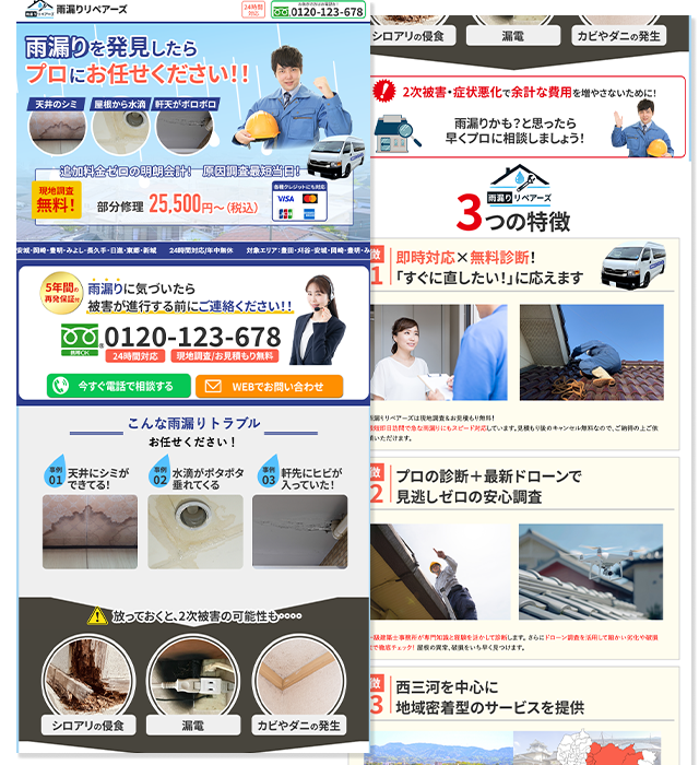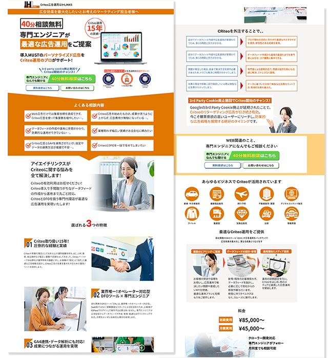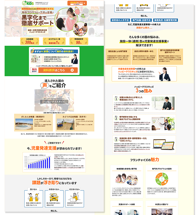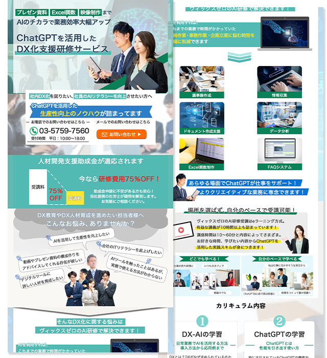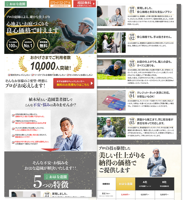 LP制作実績 ゴルフ特化パーソナルトレーニング 体験レッスン募集LP ゴルフのスコアUPを目的とした専門パーソナルトレーニングの顧客獲得用LP制作を担当 詳しく見る 国家資格保有者による害獣駆除お問い合わせLP 害獣駆除サービス「害獣駆除エキスパート」LP制作を担当 詳しく見る 銀座で画廊を経営する美術画廊の美術骨董品買取LP 美術品・骨董品の買取、査定に関するお問い合わせ獲得用LP制作を担当 詳しく見る 洗濯機クリーニングサービスお問い合わせ獲得LP 愛知県内での洗濯機クリーニングサービス「金シャチClean service」LP制作を担当 詳しく見る 体感を鍛えるキッズスポーツ教室 生徒募集LP 体幹を鍛えることを主軸とした子供向け体操教室の生徒募集LP制作を担当 詳しく見る そろばん式暗算教室の新規生徒募集用LP タブレットを使用したそろばん式暗算学習教室の生徒募集LPを担当 詳しく見る 児童発達支援事業フランチャイズ募集用LP 幼稚園・保育園に向けた児童発達支援業フランチャイズの訴求LP制作を担当 詳しく見る 埼玉エリアの造園サービスLP 地域密着型の造園サービス「おはな造園」のLP制作を担当 詳しく見る Criteo広告代行サービスLP Criteo広告代行「IHlinks」のオプトインLP制作を担当 詳しく見る 税理法人の相続確定申告問い合わせ獲得用LP 静岡県内での相続税申告相談お問い合わせ獲得用LP制作を担当 詳しく見る 愛知エリアの雨漏り修理サービス集客LP 地域密着型の雨漏り修理サービスの集客LP制作を担当 詳しく見る ChatGPTを活用したDX化支援サービスLP AIを活用したDX化支援の問い合わせ獲得LP制作を担当 詳しく見る パーソナルボクササイズジムの体験申し込み獲得LP 社会人女性をターゲットにしたボクササイズジムの春季キャンペーンLP制作を担当 詳しく見る