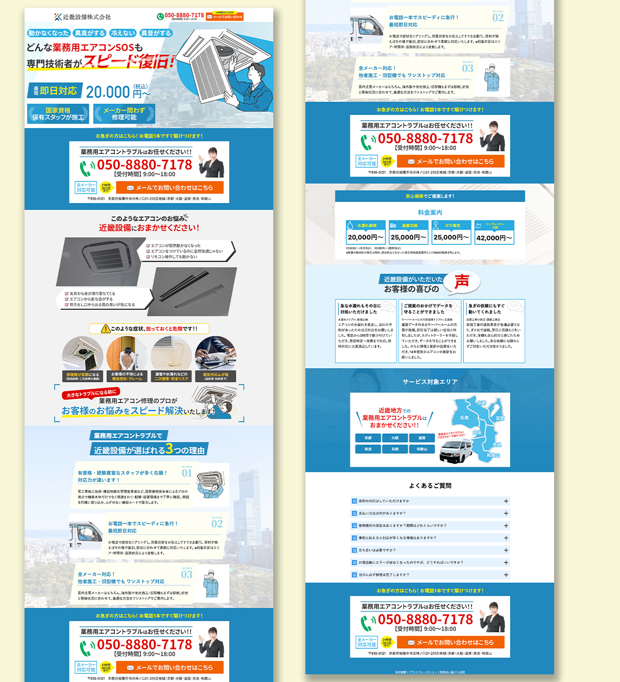 TOPはイラストでの作成を希望されたので、イラストを使いながらも「業務用エアコン」の修理だとわかりやすく。