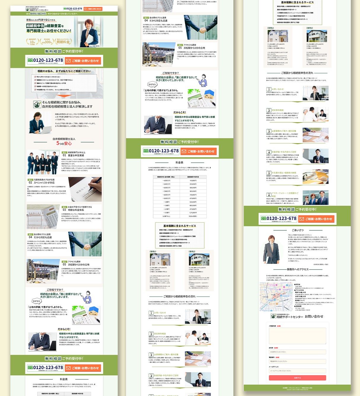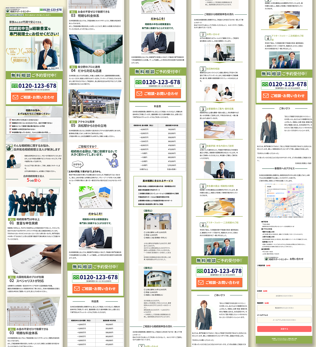 パソコンやスマホ操作に詳しくない人がターゲットとなるので流し見でも内容が伝わるような構成にして、CVとなる電話・お問い合わせボタンを大きく配置しています。