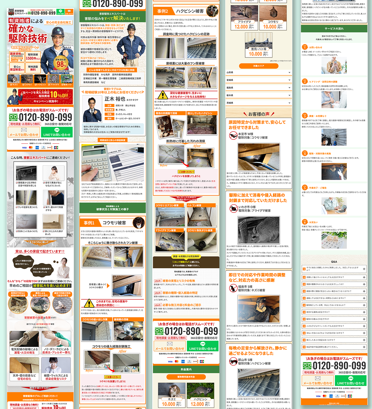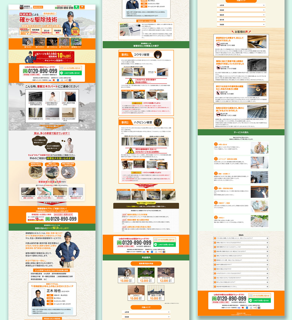 国家資格保有者であること、人柄がわかりやすいようにLPを構成。害獣の被害を放っておくことでいかに危険な状態になるかが伝わるようにデザインしています。